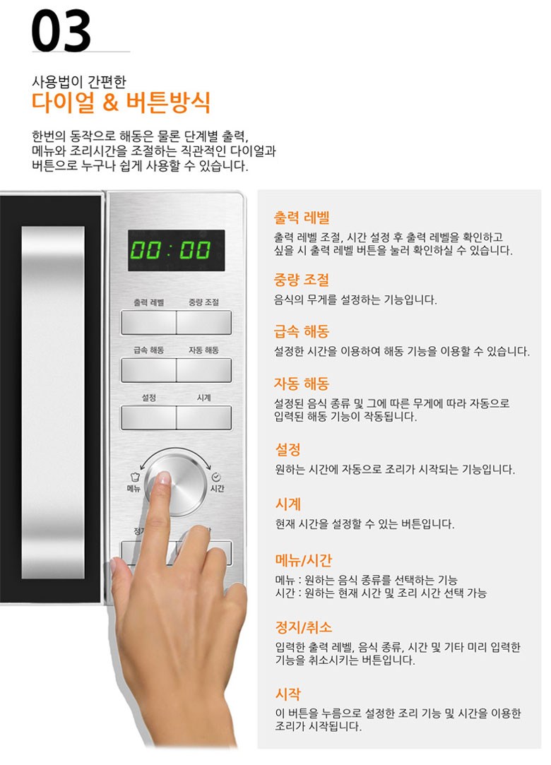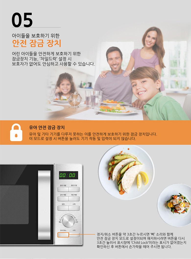 데우기, 해동 등 간단한 조리가 자동으로 가능해서 요리 초보자도 부담 적음. - 안전 기능 탑재